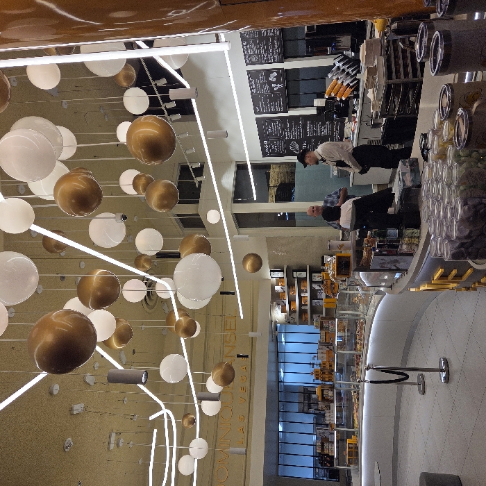 A modern indoor space features a curved service counter with pastries and beverages displayed. Behind the counter, two individuals are working. Above, decorative lighting with spherical shapes in white and gold adds a sense of luxury. Glass windows and displays reflect a cool blue tone. The interior design is clean, with a focus on the display of products and a contemporary aesthetic.