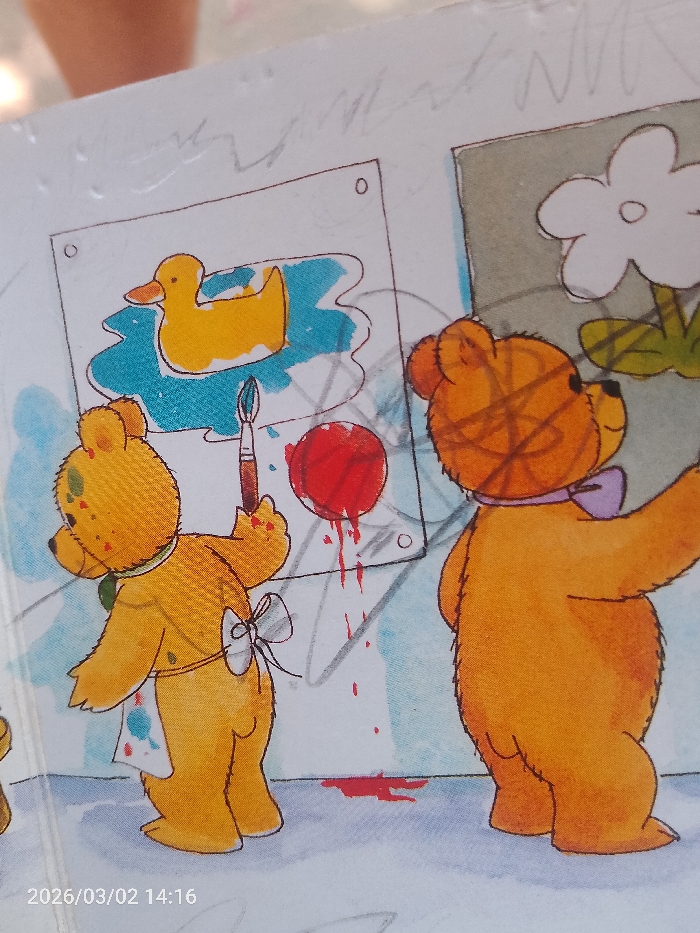 The image is a photograph of a printed illustration, likely from a children's book, taken at an oblique angle. The illustration depicts an indoor scene featuring three anthropomorphic teddy bears engaged in an art activity. The specified location of Las Tejerías, Venezuela, is not visually ascertainable from the depicted scene, which lacks any external geographical markers. In the foreground on the left, a yellow-orange teddy bear stands with its back mostly to the viewer, wearing a white apron splattered with blue, green, and red paint. Green paint spots are visible on its head. It holds a brown paintbrush with a red tip, angled towards a white sheet of paper tacked to a light-colored background. This paper displays a red circular object from which red paint drips downwards, forming streaks on the paper and a small puddle on the surface below. To the left of this, another white sheet of paper, also tacked, shows a yellow rubber duck floating in blue water. To the right of the first bear, a second yellow-orange teddy bear also stands with its back mostly to the viewer, wearing a light purple bow tie. Its head exhibits visible pencil or crayon scribbles in a crisscross pattern. Its right arm is raised, extending out of frame to the right. A third, smaller teddy bear is partially visible on the far left edge of the image. The background consists of a plain light-colored surface, possibly a wall, with faint, irregular pencil or crayon scribbles visible above the artworks. The overall environment suggests an art studio or a creative play area. A faint date stamp "2026/03/02 14:16" is visible in the bottom left corner of the photograph.