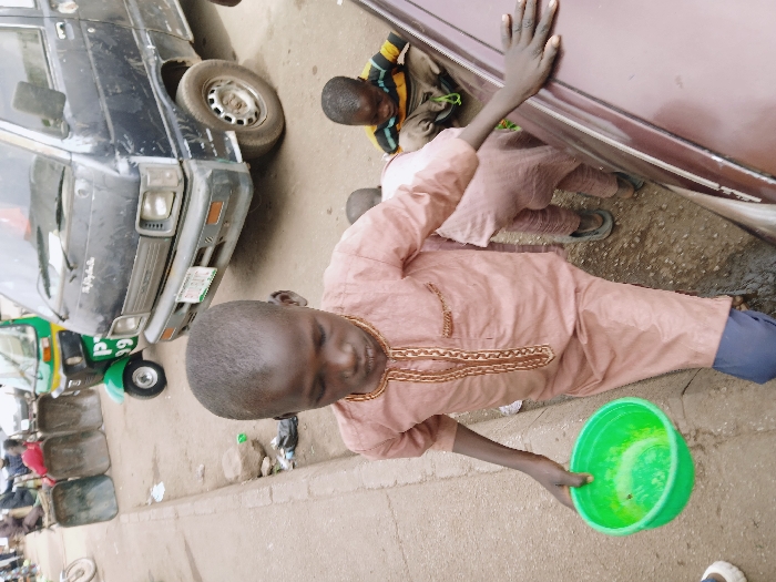 The image captures an urban street scene in Masvingo, Zimbabwe, under daylight conditions. In the immediate foreground, a young boy, approximately 6-10 years old, with dark skin and short hair, stands partially facing the viewer. He wears a long, light peach-colored tunic adorned with gold-colored embroidery around the V-neckline and chest, over dark blue trousers. His left hand holds an empty, bright green plastic bowl, while his right hand rests on the dark-colored (possibly maroon or brown) side panel of a vehicle. The boy's gaze is directed downwards. Behind the primary subject, another young boy in a light-colored tunic is visible bending forward. Further back, a third young boy, dressed in a horizontally striped shirt (yellow, black, and green) and dark trousers, is seated on the ground near the rear of the dark-colored vehicle, looking down. In the mid-ground, a dark blue or black compact minivan, showing signs of wear and age, is parked on an unpaved section adjacent to the road. Its front bumper and a partially visible license plate are discernible. To the left and behind the minivan, a green and yellow three-wheeled motorized rickshaw, with "P 99" visible on its side, is also parked. Several metal wheelbarrows are stacked or positioned near the rickshaw. In the far background, additional indistinct figures and parts of other vehicles or motorcycles are present. The environment consists of a paved street with a raised concrete curb on the left, separating it from a dirt and gravel shoulder where the vehicles are situated. Scattered litter and debris are visible along the curb and on the ground.