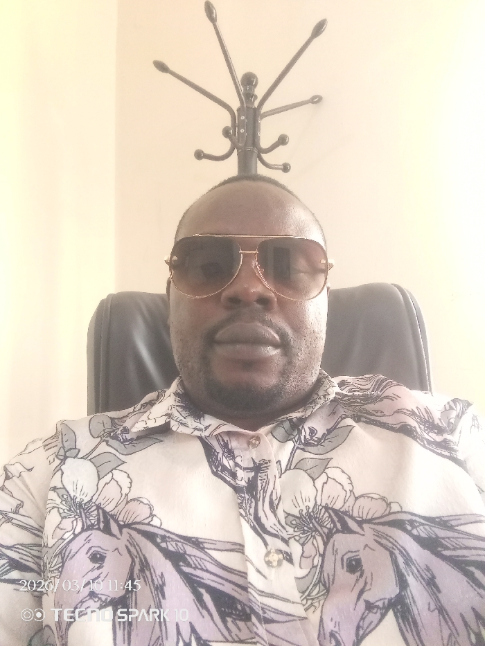 An adult male is depicted in a head-and-shoulders portrait, seated indoors. The subject, an individual of African descent, wears gold-framed aviator sunglasses with dark lenses and a light-colored collared shirt adorned with a repeating pattern of purple/grey horse heads and light green/pink floral elements. He is positioned in a black office chair, facing directly forward. Behind the subject's head, a black metal coat rack with multiple upward-curving hooks is visible against a plain, light-colored wall. A digital timestamp "2020/03/10 11:45" and a "TECNO SPARK 10" watermark are present in the lower left corner. The specific location within the city of Lokoja, Nigeria, cannot be determined from the visual content of the image.