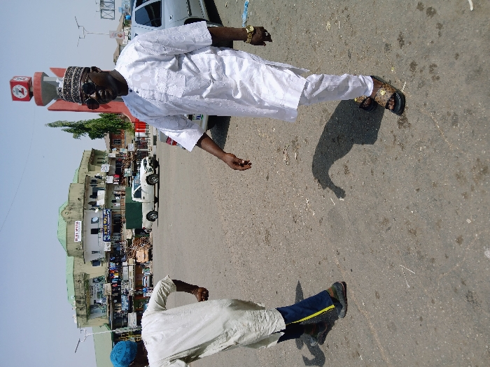 The image depicts an urban street scene in Mumbwa, Zambia, under bright daylight. In the foreground, two adult males are walking on an asphalt surface. On the right, a man is seen walking towards the left of the frame, wearing a white embroidered tunic and trousers, a patterned cap, dark sunglasses, and leopard-print slides. A gold-colored watch is visible on his left wrist. On the left, another man is viewed from behind, walking away towards the left, wearing a light-colored tunic, dark blue trousers with a yellow stripe, and a light blue cap. In the background, a multi-story commercial building with a light green roof and light-colored walls features multiple storefronts and balconies. Signage on the building includes text such as "DR. M WALA" and "ALMIGHTY." A white pickup truck with a dark green canopy is parked in front of this building. Partially visible on the far right is a silver sedan. A red and white monument-like structure, topped with a symbol resembling a 'Z' or '2', stands behind the man on the right, with a tall green tree adjacent to it. The sky above is clear blue.