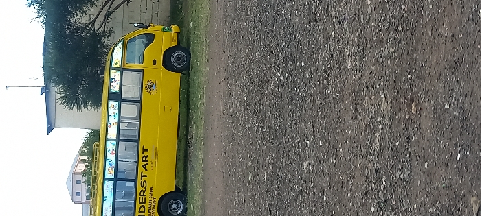The image presents a static outdoor scene featuring a yellow school bus. The bus, identified by "UNDERSTART PRIMARY SCHOOL" and "SECONDARY" text on its side, also displays "P.O. Box 72583-00200 Nairobi, Kenya", confirming the location. The vehicle's side windows are decorated with multiple colorful cartoon illustrations. The bus is parked on an unpaved ground composed of dark grey and brown gravel and dirt. In the background, to the left, a multi-story building with a light-colored facade and a dark roof is visible. To the right, behind the bus, is a single-story building with light-colored walls and a flat, dark roof, featuring a metal antenna. A tree with green foliage stands in front of this right-side building. No individuals or active interactions are present in the frame. The sky is bright, indicating daytime.