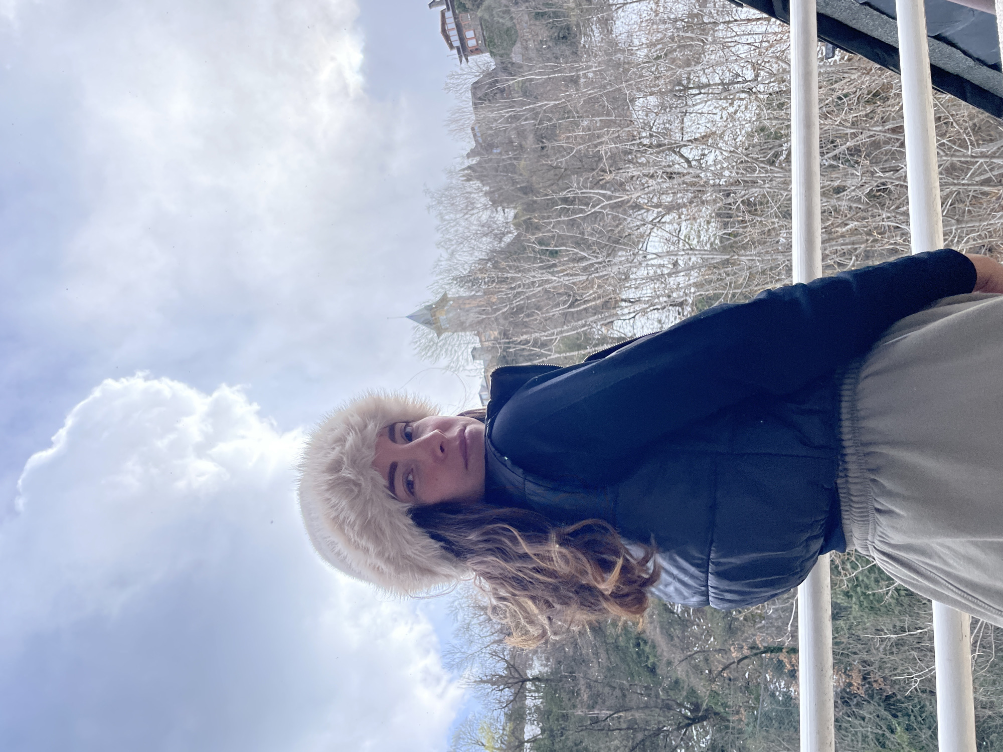 woman wearing a fur hat, a black jacket and grey sweatpants, leaning against a white railing