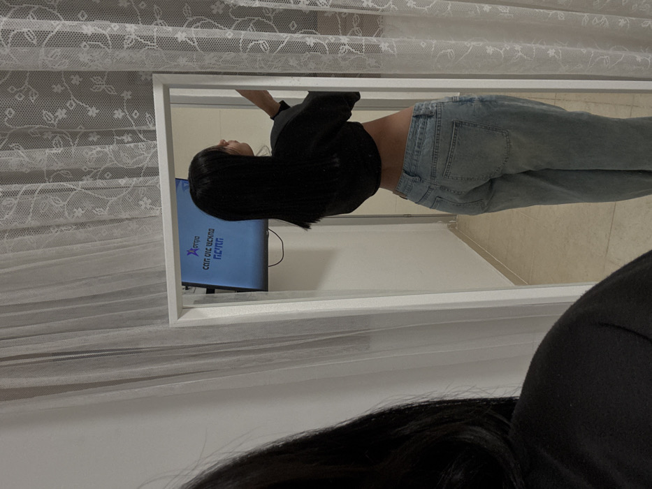An indoor scene in a private residence in Hod HaSharon, Israel, is depicted. The primary subject is a person, likely female, whose reflection is visible in a white-framed, full-length mirror. The reflected individual is observed from the rear, wearing a black long-sleeved crop top that exposes the midriff and light blue denim jeans. She has long, straight dark hair. Her left arm is slightly raised towards the right side of the frame, suggesting an action or adjustment. The person taking the photograph is partially visible on the far left, showing the back of their head and a portion of their left shoulder, dressed in a black top, indicating a mirror selfie. In the background of the reflection, a television screen is mounted on a white wall. The screen displays a blue background with white Hebrew text. The top line reads "אסטר" (Astra), followed by "שבוע טוב ויום" (Good week and day), and "מבורך" (blessed), forming the greeting "Good week and blessed day." The room features light-colored floor tiles and a light-toned baseboard. White, sheer curtains with a floral lace pattern hang on the right side of the image, partially obscuring the background.