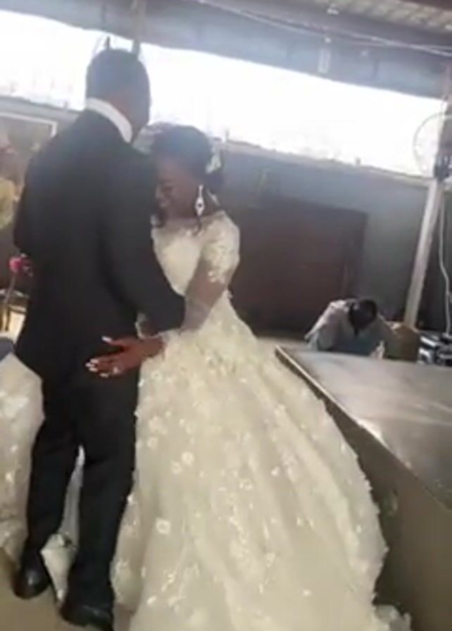 bride and groom dancing. The bride is wearing a white wedding dress with long sleeves and flower embellishments. The groom is wearing a black suit. They are smiling and appear happy. They are dancing indoors on top of a long gray surface. Other people are present, but the camera focuses on the couple. A fan is running overhead. The background is cluttered with various items, including a red stool, wooden furniture, and some electrical equipment. Another person is laying prone on the gray surface.
