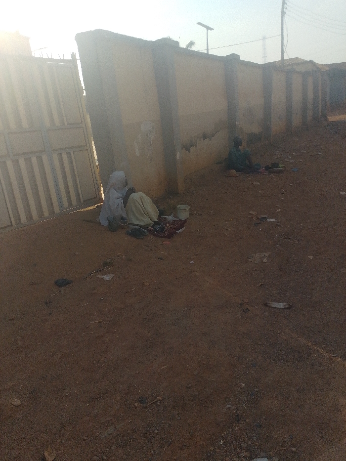 This image depicts an outdoor scene in Akwanga, Nigeria. The foreground consists of reddish-brown, unpaved dirt ground with scattered debris, including small pieces of paper and plastic. Along the right side, a light-colored plastered wall, likely concrete, with distinct dark vertical pillars, extends into the background. To the far left, a large, light-colored metal gate with horizontal and vertical paneling is partially visible, appearing closed. Above the wall in the background, a street lamp on a pole and overhead power lines are visible against a bright, hazy sky. Two individuals are seated on the ground along the base of the wall. The first individual, positioned to the left, is dressed in light-colored attire, including a white head covering and a tan or cream-colored garment. This person is facing away or has their head bowed. Adjacent to them on the ground are a white plastic bucket, a dark fabric item, and a patterned red cloth with other small, indistinguishable objects. The second individual is seated further to the right along the wall, wearing dark green or blue-green clothing, also looking downwards. Near this individual, a light-colored hat and other small items are on the ground. Both individuals are static, seated directly on the unpaved surface. No direct interaction between them is apparent.