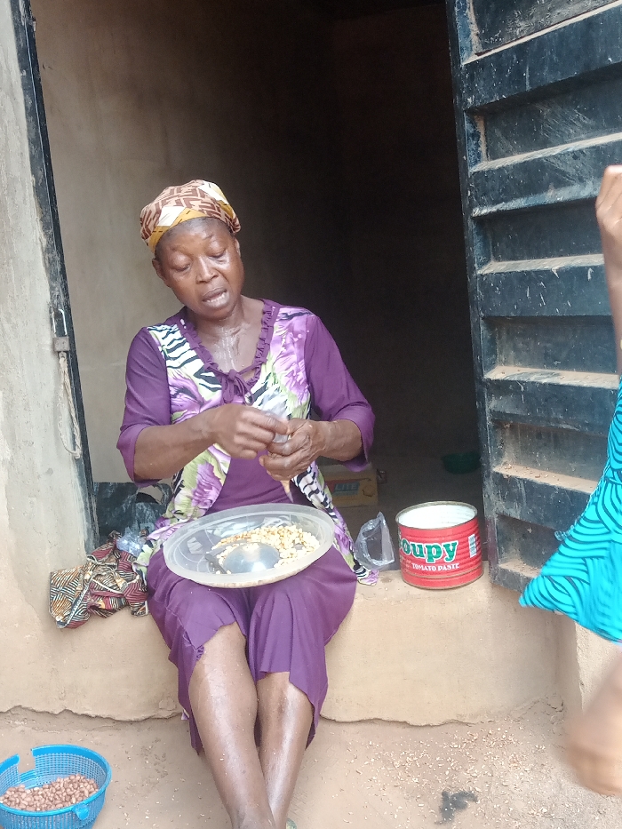 An older woman sits on a dirt ledge in front of a doorway. She wears a purple dress and head covering. She holds a plate filled with peanuts on her lap and appears to be shelling them. A blue basket filled with unshelled peanuts sits on the ground to her left, and a can of tomato paste is on her right. Debris litters the ground around her. A child stands on the right side of the image with a blue patterned dress.