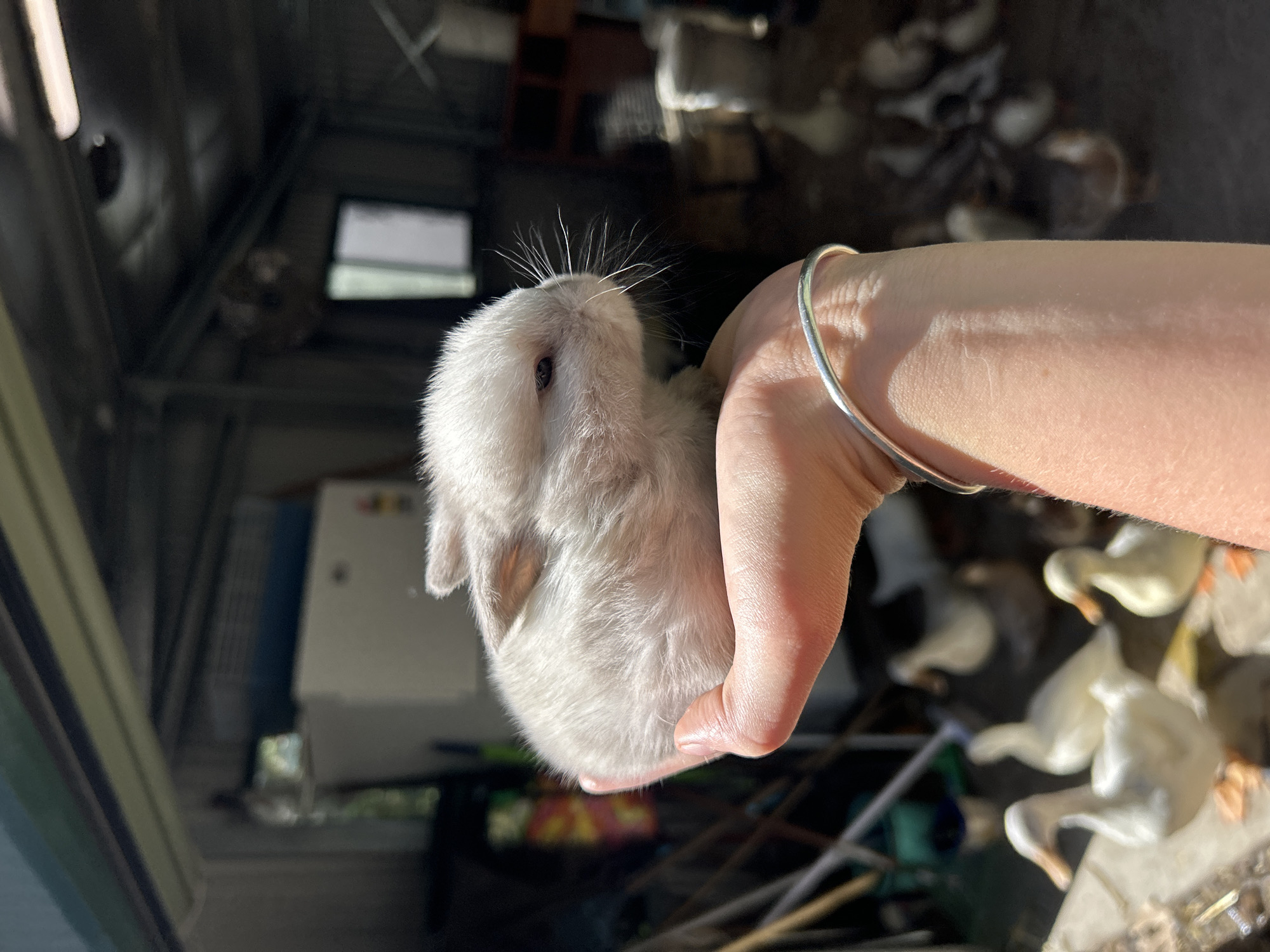 - "A close-up photograph taken in Russell Vale, Australia, features a human's light-skinned left hand, wearing a plain silver bangle bracelet, cupping and holding a small, light grey baby rabbit" by FM-A0fME3, licensed under CC BY 4.0