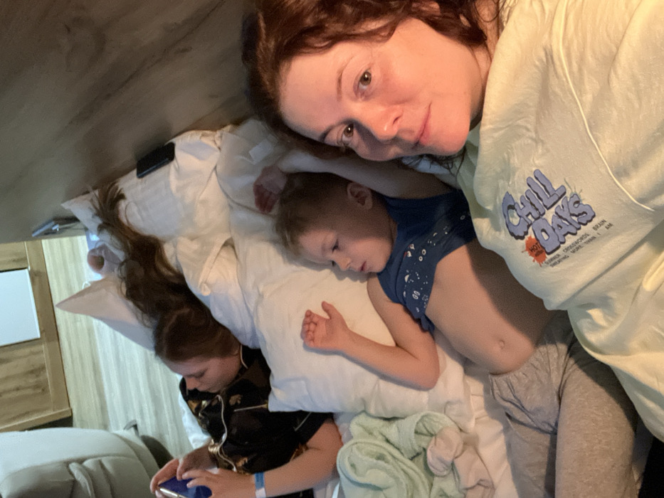 Three individuals are observed lying on a bed within an indoor setting. In the foreground on the right, an adult female with reddish-brown hair is positioned, looking directly towards the camera with a subtle smile. She is wearing a light-colored top featuring the text "CHILL DAYS." Adjacent to her, a young male child, estimated to be between three and six years old, lies on his back, gazing to the left. He is dressed in a blue tank top with white patterns and grey sweatpants, with his stomach partially exposed and arms slightly raised. In the background on the left, a second female, consistent with a child or teenager, is observed lying on her side, intently focused on a mobile phone she holds in both hands. She wears dark-patterned pajamas and a blue wristband on her left wrist. A separate black mobile phone is resting on a white pillow near her head. The bedding consists of white pillows and sheets, with a folded light green textile present near the young boy. The surrounding environment includes a light wooden floor, a partial view of a light-colored upholstered chair or sofa, and a wooden wall panel or headboard. No visual elements within the image provide confirmation of the location being Glazov, Russia.