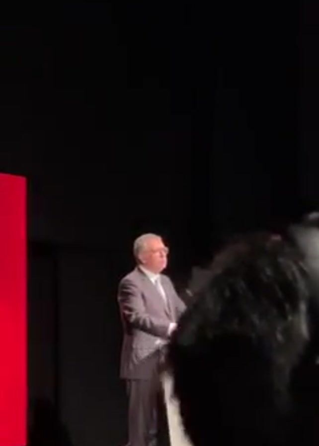 A medium shot captures an older man in a grey suit, light blue shirt, and tie, standing behind a podium on a stage. The man has white hair and is wearing glasses. He is addressing the audience, visible only as dark silhouettes in the foreground. A red panel is on the left side of the frame. The podium is white with a green, yellow, and red gradient design and an emblem at the top. The background is solid black.
