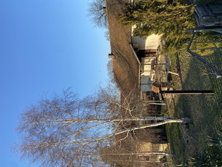 The image displays an exterior residential scene in Palilula Urban Municipality, Serbia, under a clear, bright blue sky with no clouds. The lighting suggests a low sun angle, casting long shadows from left to right across the ground. In the left foreground and mid-ground, multiple bare deciduous trees, predominantly birches with white bark, are prominent. Their branches are devoid of leaves, indicating late autumn or winter. To the immediate left of these trees, a smaller, secondary building with a tiled roof and wooden railings is partially visible. The ground is covered in sparse, yellowish-green grass. The primary structure, located on the right mid-ground, is a single-story house with white or light-colored plastered walls and a reddish-brown tiled roof. A brick chimney is visible on the roof towards the center-right. An outdoor air conditioning unit is mounted on the wall below the roofline. A covered porch or veranda, supported by dark posts, extends along the front of the house, revealing a dark wooden entrance door and an outdoor dining setup with a table and chairs. Steps lead up to the porch area. In the center foreground, a partially constructed or disused outdoor grill or fireplace made of red brick is visible, with some wood logs stacked near its base. A dark metal gate is partially present in the lower right foreground. A large evergreen shrub or tree is situated in the right mid-ground, partially obscuring the front of the main house. No individuals or animals are visible within the scene.