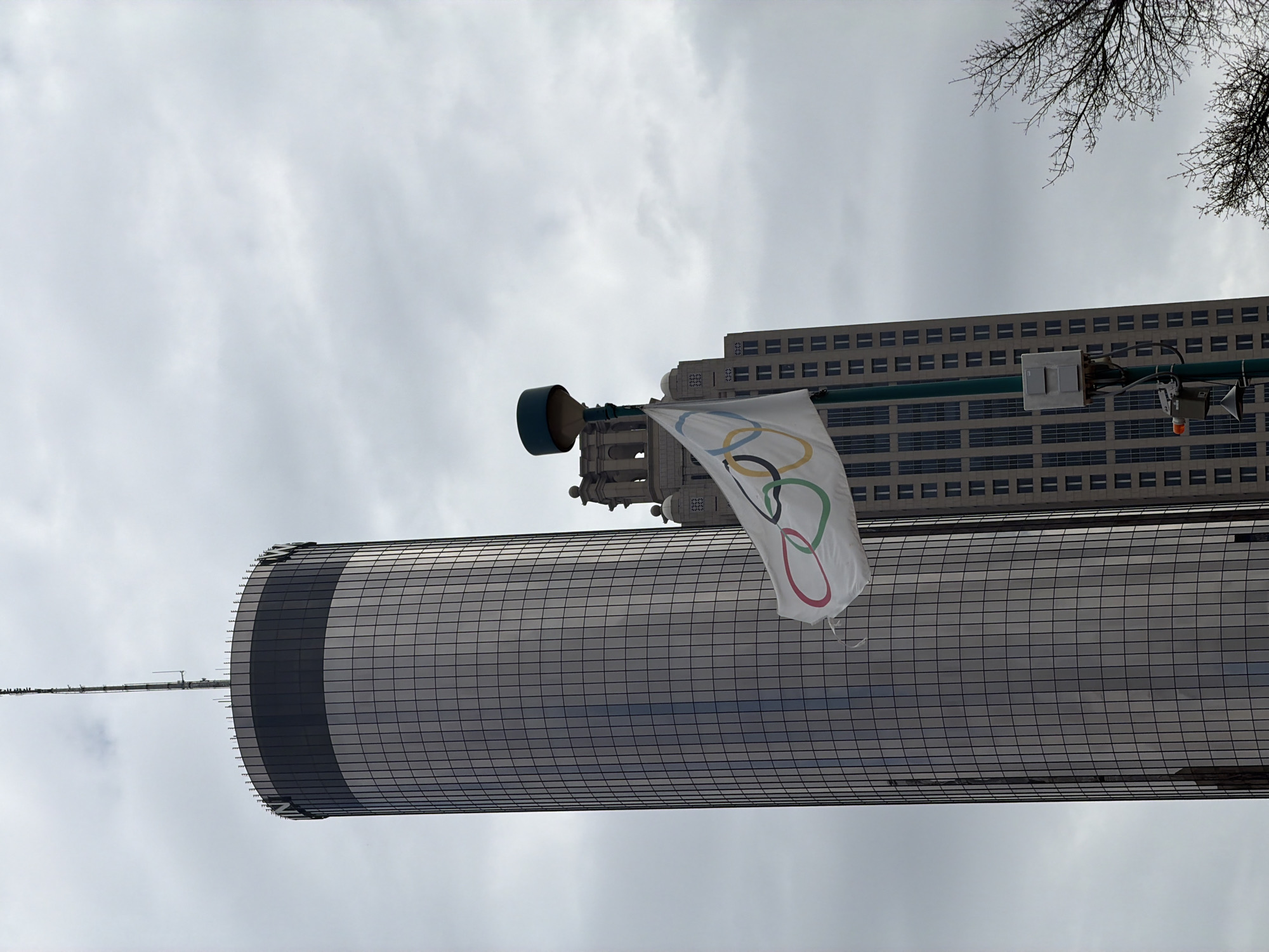 Olympic Rings flag prominently displayed in Atlanta, Georgia, USA. The flag is positioned in front of two skyscrapers, likely within the downtown area. The environment includes overcast skies and bare tree branches in the upper right corner, suggesting a cooler season. The buildings are tall and modern, with one having a rounded facade and the other a more traditional rectangular shape with many windows.
