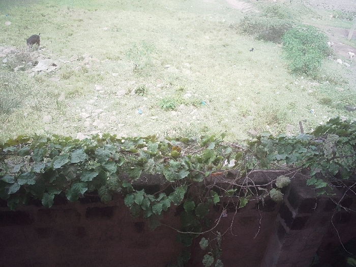 The scene depicts an outdoor environment in Juja ward, Kenya, observed from an elevated perspective overlooking a lower terrestrial area. In the foreground, a dark brown, possibly brick or concrete, retaining wall or ledge is extensively covered by dense green foliage from a climbing plant, featuring broad leaves and some intertwining bare branches. Beyond this foreground structure, an uncultivated field extends into the mid-ground and background. This field is characterized by sparse light green and yellowish-green vegetation, numerous scattered grey stones, and visible debris, including a blue plastic item. A narrow, unpaved dirt path is faintly discernible diagonally across the upper-left portion of the field. A dark-colored quadrupedal animal, consistent with a dog or goat, is positioned on the left side of the field near a cluster of rocks. A second, lighter-colored quadrupedal animal, consistent with a dog, is partially visible on the far right side of the field. Several small green bushes are distributed throughout the field. The illumination is diffused, suggesting an overcast sky.