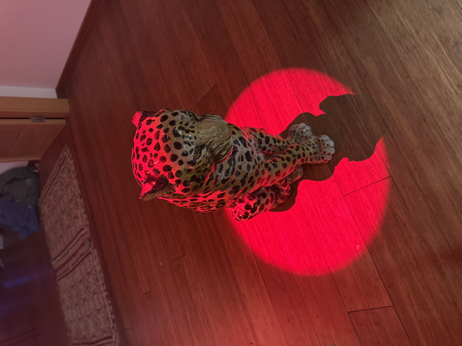 The scene depicts a glossy ceramic statue of a spotted feline, resembling a jaguar or leopard, positioned on a polished wooden floor in what appears to be an indoor setting in Segovia, Spain. The statue, primarily light brown with distinct dark brown to black spots, is rendered in a sitting posture, facing slightly downwards and to the viewer's right. A concentrated, circular beam of intense red light illuminates the statue from the front-left, casting a prominent dark shadow to its right. The wooden floor planks run horizontally across the frame. In the blurred background, a light-colored rug with darker horizontal stripes is visible, with indistinct objects, possibly a blue bag and a green item, situated beyond it against a light-colored wall. A partial wooden door frame is visible on the right side of the background. No individuals are present in the image.