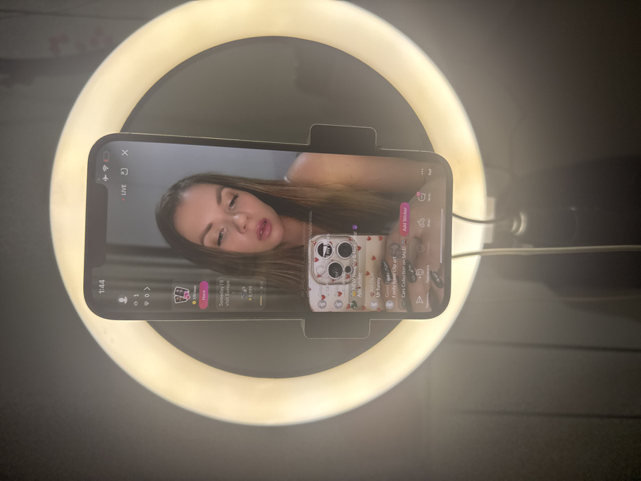 - "A phone is mounted in a ring light and displaying a live video of a woman" by FM-HTgwN2, licensed under CC BY 4.0