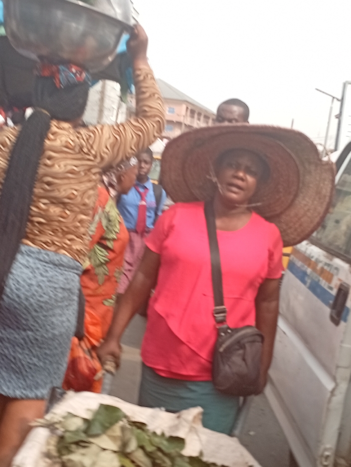The image depicts an outdoor street scene in Onitsha, Nigeria, characterized by human activity and commercial elements. In the left foreground, a woman viewed from behind wears a brown textured long-sleeved top and a light blue patterned skirt, balancing a large, silver-toned metal basin on her head, which she supports with her raised right arm. Dark braids extend down her back. Centrally positioned, a woman faces slightly right, wearing a wide-brimmed woven straw hat, a layered pink short-sleeved top, and a dark green skirt. She carries a dark brown crossbody bag on her right hip, and her mouth is partially open. Her right hand is obscured but appears to be holding an object or another individual's hand, connecting her to the space just above the green leaves. A pile of green leaves, consistent with fresh produce, is arranged on a light-colored cloth or sack in the lower center foreground. In the mid-ground, between the two main women, a person in an orange patterned dress is visible. To the left of the hat-wearing woman, an individual wearing a blue shirt and a red tie is discernible. The upper portion of another person's head and shoulders are visible directly behind the hat-wearing woman. On the far right, the front passenger side of a white van with blue or light-colored horizontal stripes is partially visible, with its door slightly ajar. The background features light-colored buildings and utility infrastructure under an overcast or bright sky, indicating daytime.