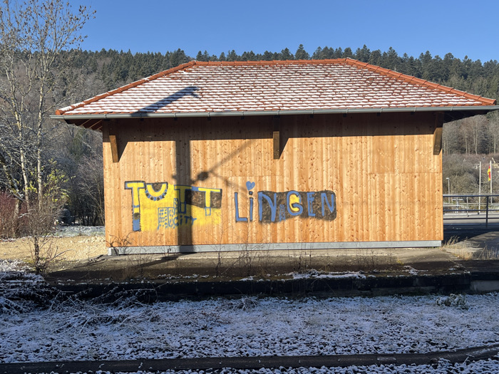 A small, rectangular building with a terracotta-tiled roof dusted with snow. It's constructed of light-colored wooden planks and features graffiti in yellow and blue. The word "TUTTLINGEN" is visible. The structure stands on a concrete base with a foreground of frosty grass and railway tracks. Behind the building, a hillside covered with dense trees rises. The sky is clear and blue.