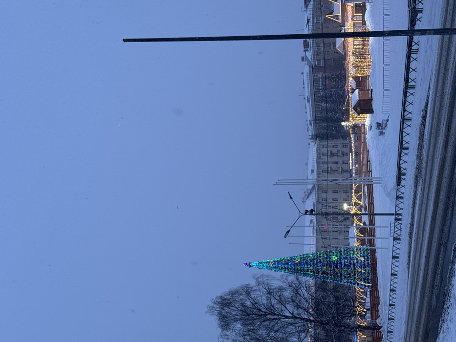 A sideways view of a winter scene shows a large decorated Christmas tree with bare branches in the foreground. Behind it are streetlights and a building. Snow covers the ground and road on the right side of the image. In the distance, there are buildings and a market with Christmas lights. The sky is overcast.