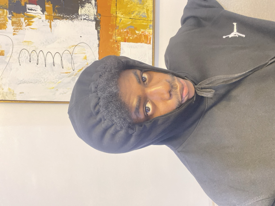 A medium close-up indoor photograph depicts a dark-skinned individual, appearing male, centered in the frame