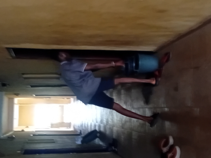 In a dimly lit hallway, a man in a gray shirt and dark shorts is struggling to lift a large, teal-colored object, possibly a tank