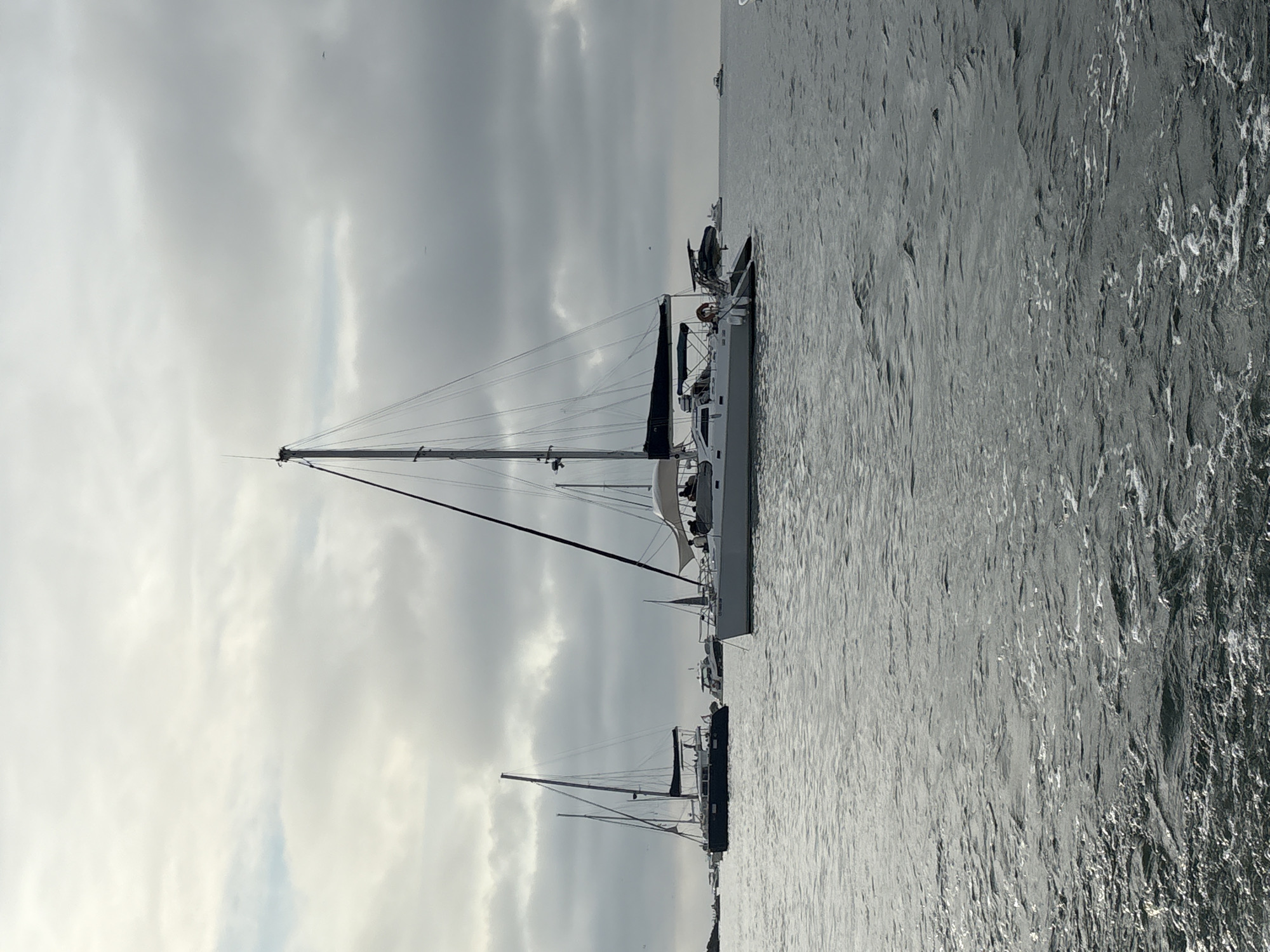 seascape with a sailboat in the foreground. The water appears rippled, reflecting light. The sky is overcast with heavy clouds. A second, smaller sailboat is visible behind the first, and other vessels are in the distance. The location is in Ancón, Peru.