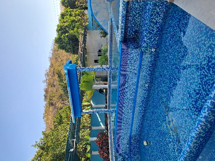 The image depicts an outdoor multi-level swimming pool complex located in Playa Colorada, Venezuela, under a clear blue sky. In the foreground, a large, irregularly shaped swimming pool is visible, its interior surfaces, including walls and steps, uniformly tiled with small blue and white mosaic tiles. The pool contains clear water, reflecting the sky, and a single yellow and white striped inflatable ball floats near the left edge. In the mid-ground, a central blue structure features a flat blue roof supported by two pillars adorned with mosaic tiling, positioned between distinct sections of the pool complex. Beyond this structure, further pool areas and various light-colored buildings with metal roofs are present, some shaded by green tarpaulin coverings. One structure appears to be constructed from concrete blocks. Vegetation is abundant, with lush green trees and bushes surrounding the complex, including reddish-leafed plants in the immediate foreground. In the background, a large hill or mountain, densely covered in trees, rises against the horizon. A single individual, dressed in dark clothing, is partially discernible in the mid-ground, standing near a table under a shaded area, partially obscured by a mosaic-tiled pillar and foliage. No specific actions or interactions are clearly visible from this individual.