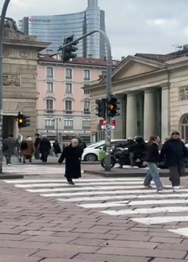 busy city street in Milan, Italy. People are crossing the street at a crosswalk. There are cars and a motorcycle stopped at a traffic light. In the background, there are buildings, including the UniCredit Tower. The day appears overcast.