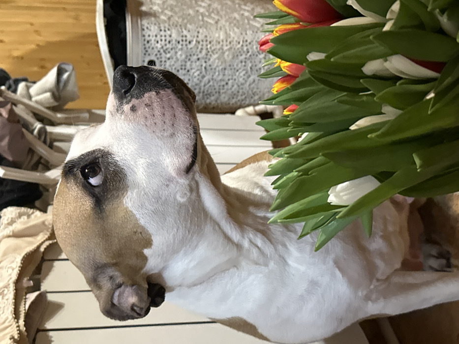 - "An indoor scene in Базарово, Russia, depicts a white and tan-brown American Staffordshire Terrier-type dog positioned in the left-center of the frame, partially obscured by a bouquet of tulips" by FM-2t2Dl2, licensed under CC BY 4.0