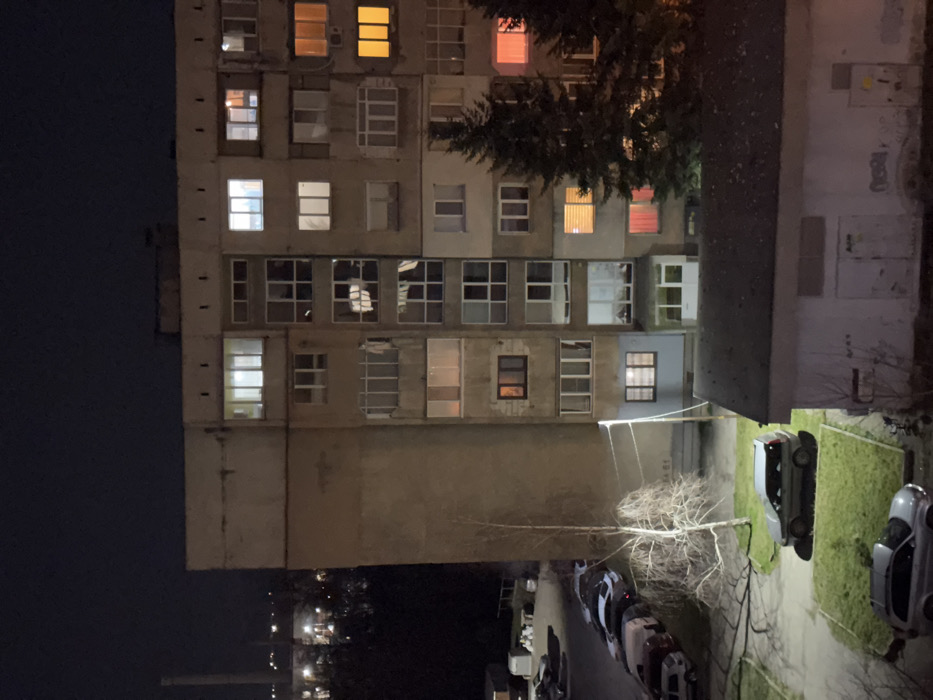 The image displays a nighttime urban scene in Pernik, Bulgaria. A weathered, multi-story concrete apartment building, likely of socialist-era construction, dominates the central and right portions of the frame. The building features at least eight visible floors with various window configurations and enclosed balconies. Numerous windows are illuminated, presenting diverse light temperatures, including bright white, warm yellow-orange, and distinct red-pink from interior spaces. Clothes are visible hanging to dry within at least two balconies or windows on the left-center facade of the building. In the midground and foreground on the left, a paved parking area contains multiple parked cars, including sedans and wagons. A silver SUV is parked on a grassy patch in the center foreground, illuminated by an unseen light source. Another silver vehicle is partially visible at the bottom edge. Several bare deciduous trees with intricate branch patterns are distributed across the grassy areas, and two tall, dark coniferous trees (likely pines) stand to the right of the apartment building, partially obscuring its lower section. A slender utility pole with horizontal support wires is visible in the lower-left quadrant. A single-story, white utility building with a flat roof and graffiti on its lower facade occupies the bottom right corner. The background on the far left reveals a distant industrial complex featuring a prominent smokestack illuminated by general city lights, indicating an active urban and industrial environment.