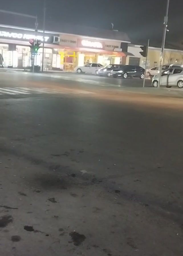 The video captures an urban street scene at night. The pavement in the foreground is dark and uneven, showing some puddles or dark spots. Across the street, there's a one-story building with businesses, including a fast food establishment called "GAVITA FAST FOOD." There is another business to the left of GAVITA with lit signage. Several cars are parked along the street and one car can be seen driving through the intersection. Pedestrians can be seen crossing the crosswalk in front of the business on the left. Traffic lights are visible at the intersection. The sky is overcast and the lighting is generally dim, illuminated by streetlights and the lights from the businesses.