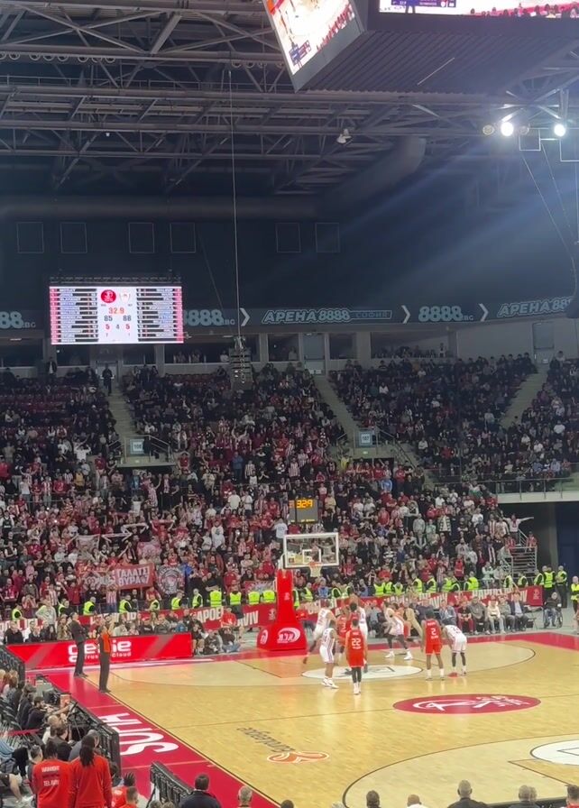 A basketball game is in progress. The crowd is large and mostly wearing red clothing. The score is displayed on a large electronic scoreboard hanging over the center of the court. The game is being played on a wooden court with red and white markings. Players in red uniforms are positioned around the free-throw line. One player in red is shooting a free throw. There are referees on the court. The arena has a high ceiling with exposed metal beams. A screen above the court shows a close-up of the game. There is advertising around the arena walls.