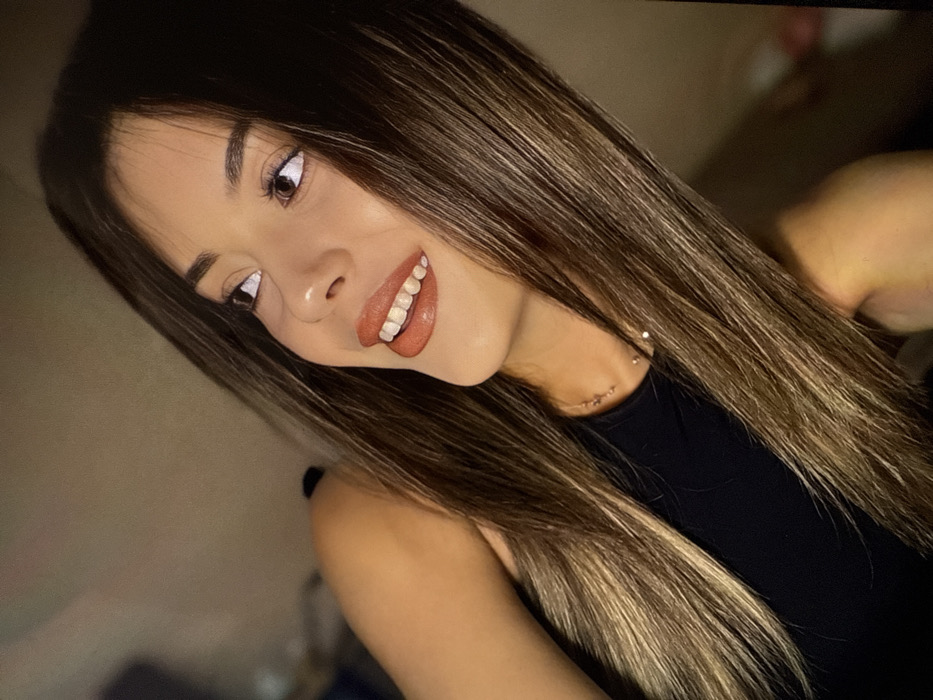 This image displays a young adult female in a headshot-style portrait, taken within an indoor setting in the city of Lukovit, Bulgaria. The subject has a light-to-medium skin tone, long, straight, dark brown hair with lighter, caramel-toned highlights. She is wearing a black sleeveless garment and a thin, gold-colored necklace with small, reflective elements. Her head is tilted slightly, and she is looking upwards and to her left (viewer's left), away from the camera. She presents an open-mouthed smile, revealing a full set of white teeth, and her lips are colored with a reddish-brown lipstick. The background is dark, uniformly blurred, and devoid of distinct features, suggesting a shallow depth of field, with illumination primarily focused on the subject.
