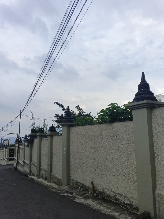 The image depicts an exterior street scene in Siexiengmai, Laos, under an overcast sky. Multiple dark utility lines stretch diagonally across the upper left portion of the frame. A textured, light-colored stucco wall with rectangular pilasters extends from the right foreground towards the left background, slightly curving. Each pilaster is topped with a dark, stylized stupa-like finial. Green foliage, interspersed with some pinkish-red flowers, is visible above the wall and behind the finials. An asphalt road occupies the lower portion of the image, bordered by a narrow concrete strip adjacent to the wall. This strip shows evidence of dirt and discoloration at the wall's base. A small wooden stake is embedded in the ground near the wall. In the left background, an additional utility pole is visible, and a sign partially displaying "HABIBI SUMMIT" is mounted on the wall. Distant, indistinct terrain is visible beneath the cloudy horizon. No individuals or active interactions are present in the scene.