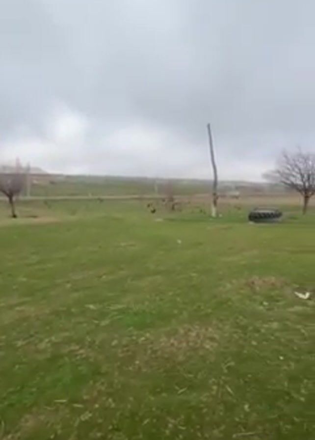 rural landscape on a cloudy day. The foreground consists of a green lawn with scattered dry patches. A tall, wooden utility pole stands prominently in the middle of the scene, with electrical wires running across the top. A large, black tire lies on the ground to the right of the pole. Chickens are visible pecking in the grass near the pole and a simple wooden structure. In the background, there is a row of buildings and houses set against a backdrop of rolling hills. The sky is overcast, suggesting a gray, possibly damp day. The camera pans slightly to the right during the video.