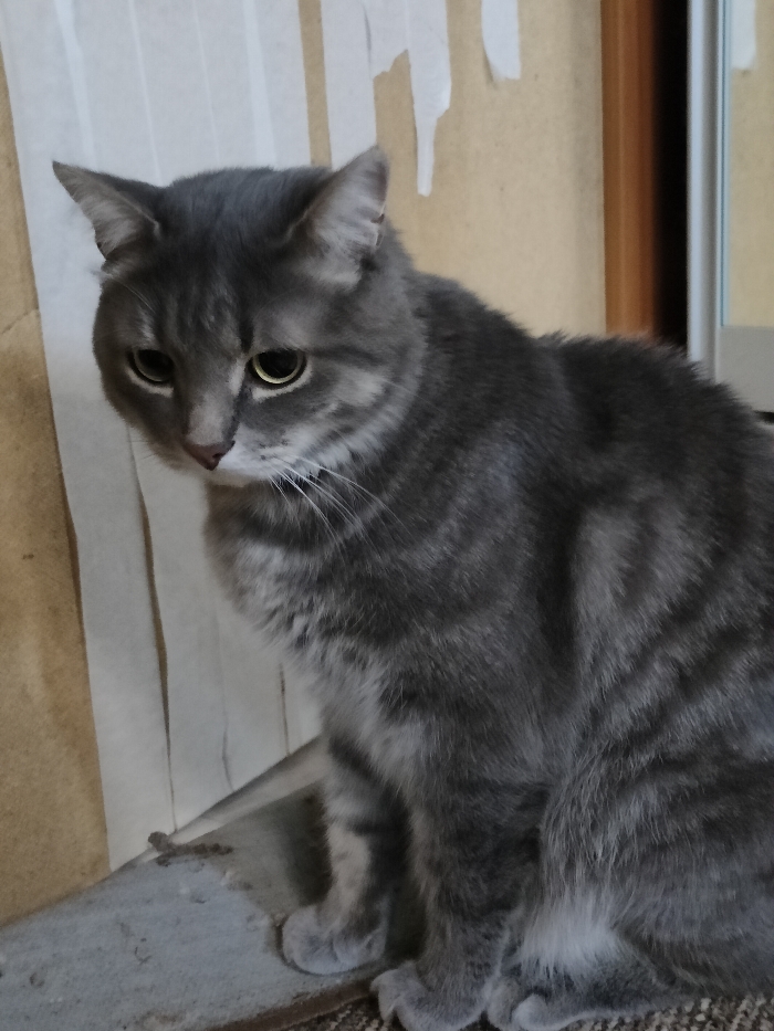 - "A gray tabby cat sits with a slightly downward gaze" by FM-jApwm1, licensed under CC BY 4.0