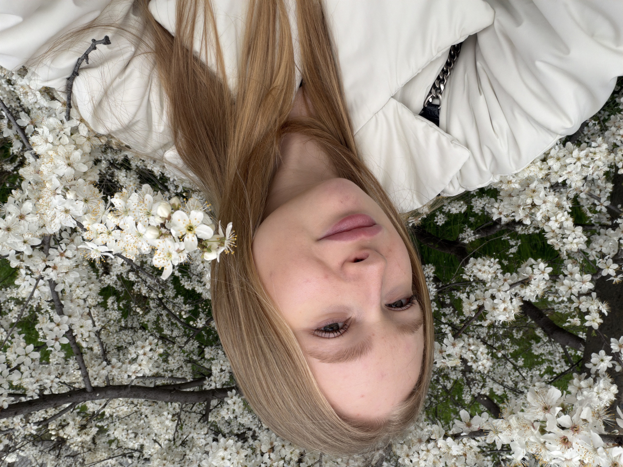 - "A young woman with fair skin and light brown hair lies on a surface covered in blooming white flowers, possibly a tree branch" by FM-t12ef2, licensed under CC BY 4.0