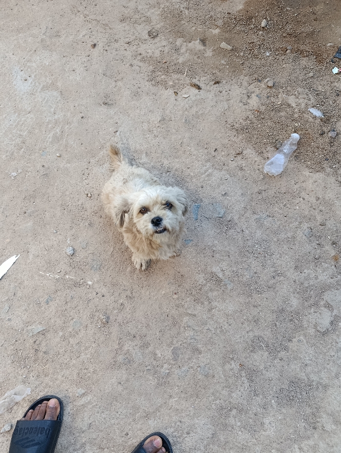 A tan, small dog with dark eyes and a fluffy coat is centered in the frame, looking up. The dog stands on a dirt or concrete surface. A discarded clear plastic bottle rests on the right side. A partial view of two feet wearing black sandals is visible at the bottom. The ground is textured with varying tones and small pebbles. A sliver of white object appears on the left.