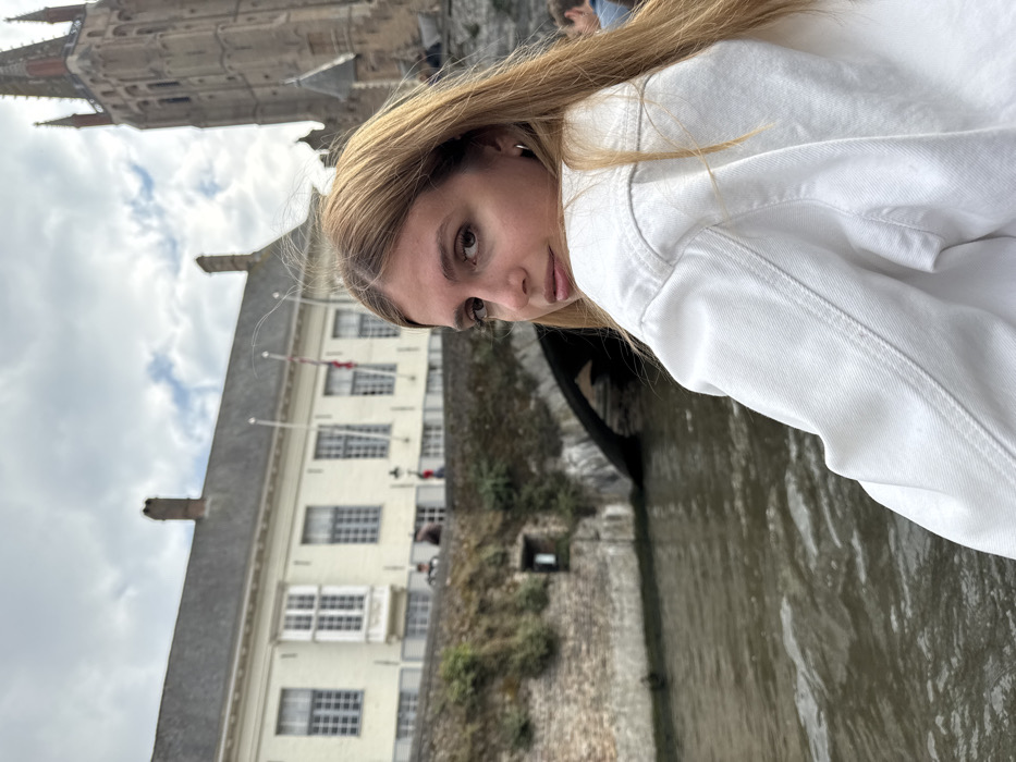 A young Caucasian female, with long, light brown hair and wearing a white denim jacket, is positioned in the foreground, looking over her right shoulder directly at the camera. The scene is set on a canal in Bruges, Belgium. In the mid-ground, dark, rippled canal water occupies the lower left. A stone bridge with a visible arch spans the canal. A stone embankment, partially covered with vegetation, rises from the canal on the left. In the background, on the left, stands the Gruuthuse Museum, a multi-story building with a light-colored facade, multiple windows, a dark pitched roof, and two prominent chimneys. Several flagpoles with flags extend from the building's front. To the right, dominating the upper right quadrant, is the tall, dark-stone Gothic spire of the Church of Our Lady (Onze-Lieve-Vrouwekerk). Indistinct figures are visible on the embankment walkway in front of the museum. The sky is overcast with gray clouds.