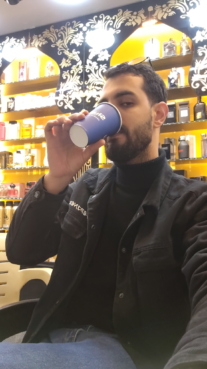An adult male with a dark beard and short dark hair is depicted from the chest up, seated indoors. He wears a black turtleneck, a black collared jacket, and blue jeans, with sunglasses perched on his head. The individual is holding a blue and white paper cup to his mouth, appearing to drink from it. The cup features white text, partially visible and reversed. The background reveals a retail environment, specifically a perfume shop, characterized by multiple glass shelves displaying numerous perfume bottles of various designs. These shelves are illuminated by warm yellow lighting from behind. Above the shelves are dark decorative panels featuring elaborate gold floral patterns, including prominent arched sections. A light-colored chair is partially visible to the left of the subject. The scene is located within a commercial establishment in Barza Municipality, Syria.