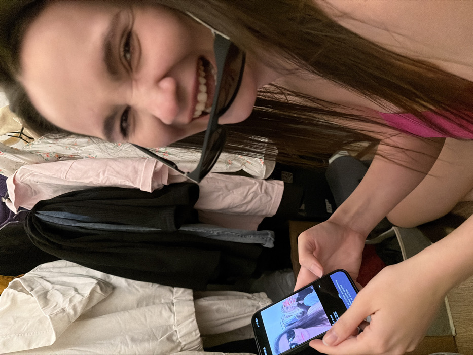 A woman with long, dark hair smiles at the camera, holding sunglasses in her mouth. She's wearing a pink top and is near a pile of clothes, including white, pink, and black items. Her hands are holding a smartphone displaying a selfie of two women with drinks. The photo's angle is tilted, making the background appear sideways.