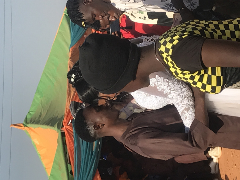 A wedding scene portrays a couple kissing. The groom is dressed in a brown shirt. The bride is in a white lace gown and a black beanie. Two people are also partially visible, one wearing a yellow and black checkered dress and another dressed in a white and red shirt. A brightly colored tent can be seen in the background.
