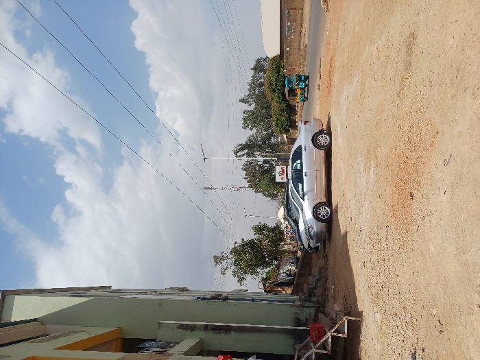 The image depicts an outdoor, daytime scene in the city of Unknown, Unknown, under a partly cloudy sky. The foreground is an unpaved, dirt ground. To the left, a multi-story building with a light green and pale yellow facade is partially visible, featuring external stairs with a red object on a landing. Two sedans are parked on the dirt ground; the front vehicle is a silver Toyota Corolla, and a dark-colored vehicle is partially obscured behind it. In the mid-ground, utility poles support multiple overhead power lines. A paved road is visible behind the parked cars, with a blue and yellow three-wheeled vehicle (auto-rickshaw type) positioned on it, facing right. Trees and shrubs line the roadside. Low-rise buildings and walls are present along the far side of the road. A sign partially displaying "PHARMACY" is visible near the road. No individuals are discernible.
