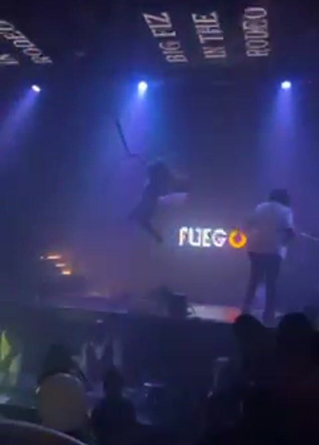 n aerial performer hanging from a metal hoop on a stage in a dimly lit nightclub. The stage is bathed in blue and purple light. A large "FUEGO" sign with a flame graphic is behind the performer. A man in a white shirt and dark pants stands on the stage near the performer. Other people, possibly bar staff and patrons, are seen in the foreground. Words “BIG FIZ” and “RODEO” appear on the ceiling. The music is audible, but unclear.