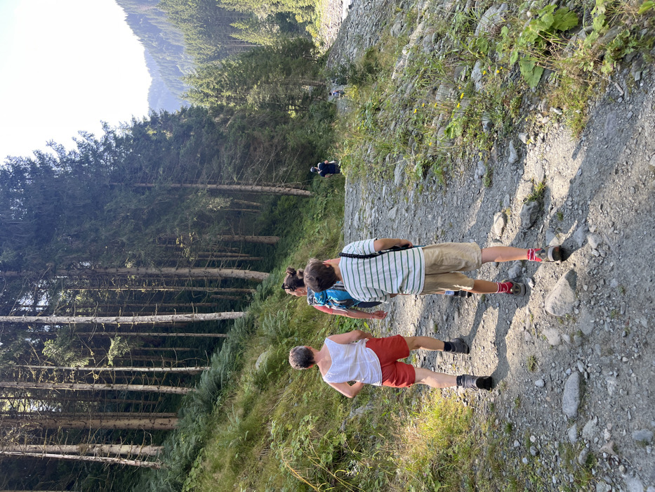 A group of four individuals is observed hiking on a gravel and dirt path in a valley near Reitlehen, Austria, under clear daytime conditions. Three individuals are in the foreground, facing away from the viewer, moving generally from the lower left towards the upper right. The closest individual to the viewer is a juvenile male with light brown hair, wearing a horizontal striped short-sleeve shirt (green and white), tan or khaki shorts, red socks, and hiking shoes. He carries a dark strap diagonally across his torso, possibly a bag. To his left, slightly ahead, is an adult female wearing a white sleeveless top, red shorts, and dark hiking shoes. Her hair is short and appears grey or light brown. Further ahead and slightly to the right of the juvenile is another adult, possibly female, with dark hair tied back, wearing a red top and carrying a blue hiking backpack. In the mid-ground, a fourth individual, dressed in dark clothing, is visible further along the path, also moving away from the viewer. The path is unpaved, consisting of small stones, gravel, and dirt. To the immediate left of the path, the terrain slopes steeply upwards, covered with dense green vegetation, including ferns and tall trees (conifers), suggesting a forest. To the right of the path, the ground slopes downwards, featuring scattered rocks, sparse vegetation, and a visible body of water, likely a river or stream, running parallel to the path. In the background, forested mountain slopes rise on both sides of the valley, with a bright sky visible above the distant peaks. Shadows from the trees and individuals are cast on the path, indicating sunlight from the upper right.