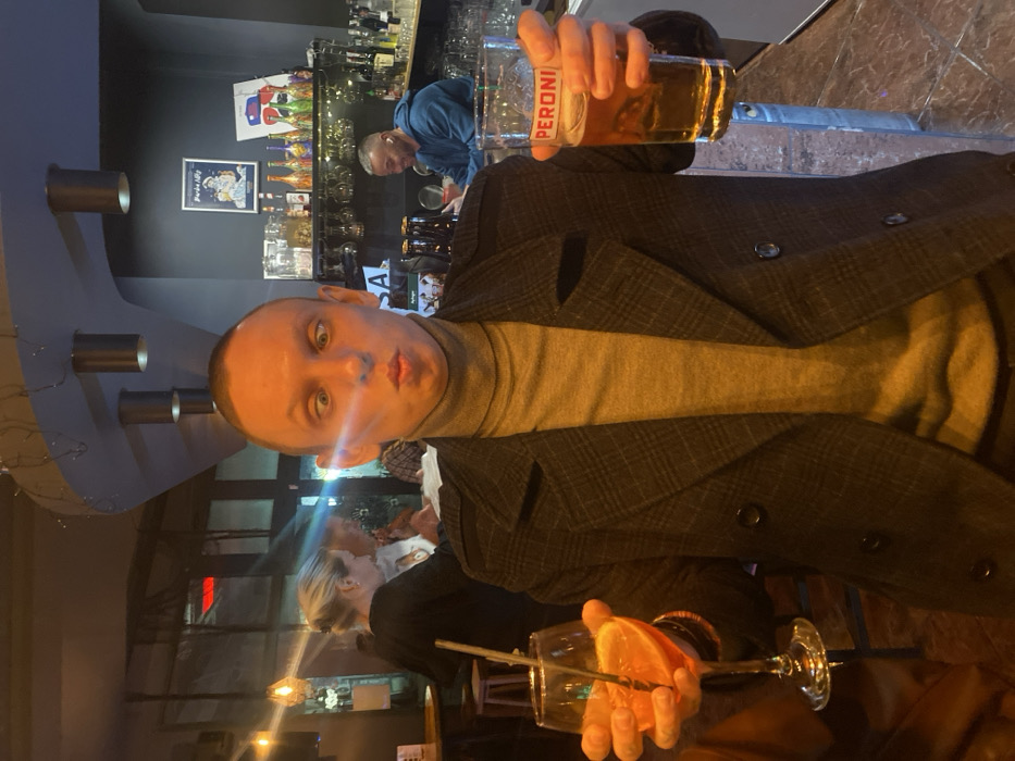 An indoor bar scene is depicted in Budva, Montenegro. In the foreground, a light-skinned adult male with a shaved head and crossed eyes presents a "fish kiss" facial expression. He wears a dark gray plaid double-breasted coat over a light gray turtleneck sweater. His left hand holds a stemmed glass containing an orange cocktail with an orange slice and a straw. His right hand holds a pint glass of amber liquid, clearly labeled "PERONI." The man stands or sits in front of a bar counter. In the midground to the left, a light-skinned woman with blonde hair tied back, wearing a dark top, is partially visible, facing away from the camera, near a wooden table and stool. To the right, behind the main subject, a light-skinned male with short gray hair, wearing a blue hooded sweatshirt, is seated or standing at the bar, looking down. The bar area features multiple liquor bottles, inverted wine glasses on a rack, and a poster on a dark gray wall. The environment is dimly lit by artificial light sources, creating visible lens flares.