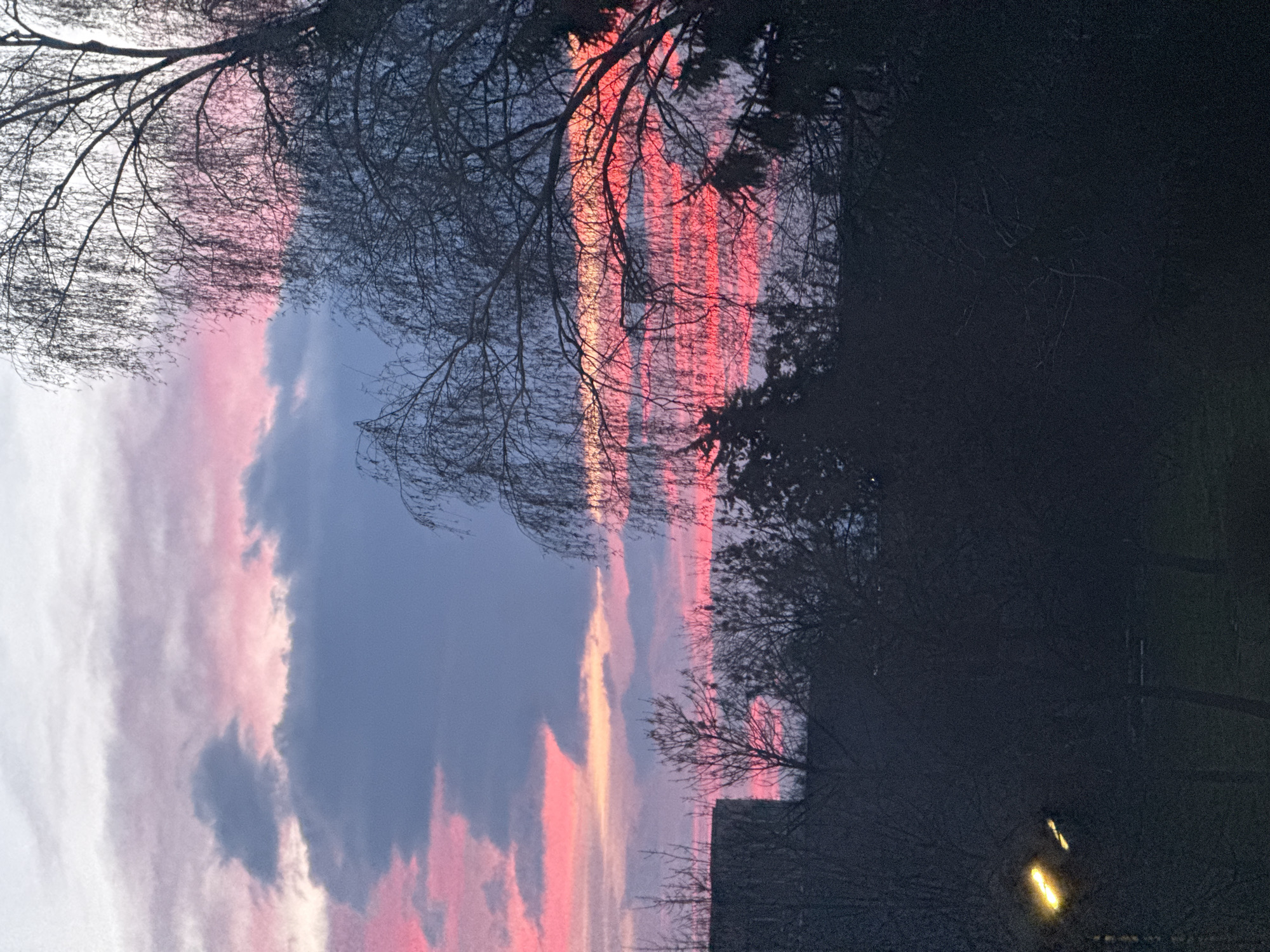 The scene depicts a twilight sky over an urban or suburban landscape in Sofia, Bulgaria. The upper portion of the sky exhibits a gradient of colors, transitioning from light gray and pale pink at the top-left to vivid horizontal bands of magenta, orange, and deep red across the middle, interspersed with darker blue-gray cloud formations. The lower two-thirds of the image is dominated by dark, undifferentiated silhouettes of numerous trees and shrubs, indicative of bare deciduous branches, suggesting a non-summer season. A large tree with fine, drooping branches is prominently silhouetted on the right side, extending from the top to the mid-ground. In the mid-left background, a dark, rectilinear building structure is partially visible. An artificial light source, likely a street lamp, emits a distinct yellow-orange glow in the lower-left quadrant. No individuals are present in the frame.
