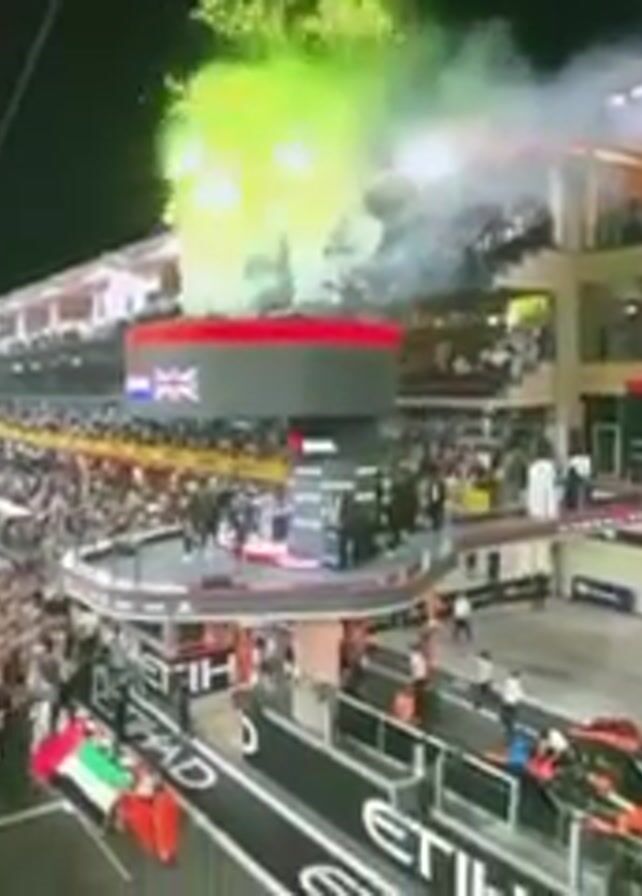 Formula One race victory celebration. The first shot is a wide view of the podium area, with a large crowd of people cheering. There is green smoke rising above the podium, and a flag is visible. The video cuts to a close-up of a race car driver struggling to open a bottle of champagne. Another driver approaches to assist. They successfully open the bottle and begin to celebrate with champagne. The backdrop includes logos for Etihad and Louis Vuitton.