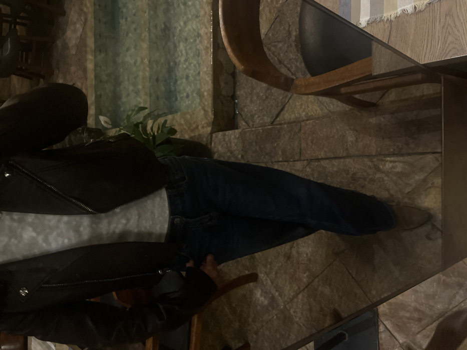 The image captures the reflection of a standing individual, from the chest down, located in Domingo Arenas, Mexico. The subject is dressed in a dark brown leather-style motorcycle jacket with an asymmetrical zipper and silver-toned hardware, a light gray ribbed long-sleeved shirt, dark blue denim jeans, and light brown pointed-toe ankle boots. The individual's left hand is partially placed in the left jeans pocket. The floor consists of irregularly shaped, multi-toned stone tiles. The background features a potted plant with green leaves and a white flower, positioned next to a shallow indoor water feature with visible stone-lined edges. In the wider background, dark wooden chairs and tables are visible, suggesting a dining or lounge setting. A partial view of a wooden chair with a dark seat and a wooden surface with a striped textile mat are also present in the foreground reflection. The scene is illuminated by dim, ambient lighting.