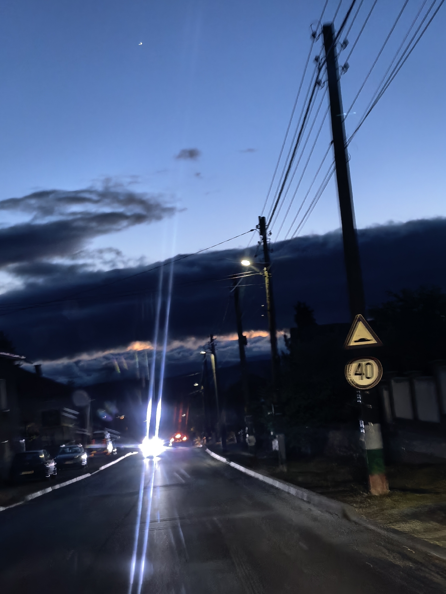 The image depicts a street scene in Resilovo, Bulgaria at dusk. The road stretches into the distance, illuminated by car headlights and streetlights. Several cars are parked on the left side of the road. Overhead power lines run along the right side of the street. A traffic sign indicating a speed limit of 40 km/h is visible on the right. The sky is a mix of blue and dark clouds. A sliver of the moon is visible in the upper center of the image.