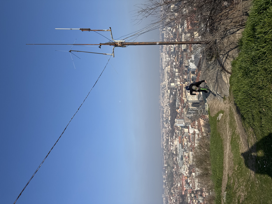 The image depicts a panoramic view of the city of Plovdiv, Bulgaria, from an elevated natural vantage point, likely one of the city's hills. The foreground features patchy green grass, exposed dirt, and large gray rock formations. Shadows of two unseen individuals are cast on the grass in the lower-left. A rusty metal pole, approximately five meters tall, stands on the right, equipped with multiple antennas, including a multi-element Yagi-style antenna and a slender vertical antenna, with various cables draped around it. A thick black cable diagonally traverses the upper-left sky. In the midground, a lone individual, dressed in dark clothing and a dark beanie or helmet, is observed in a crouched position on a rock formation, facing away from the camera, with a visible green object near their right leg. Beyond the immediate terrain, the expansive urban landscape of Plovdiv stretches into the distance under a clear, bright blue sky with a faint crescent moon visible near the horizon line. The cityscape consists of numerous buildings, dense residential areas, and some taller commercial structures, all appearing under direct sunlight, which contributes to a slight atmospheric haze over the distant city. Sparse, bare tree branches are visible on the far right.